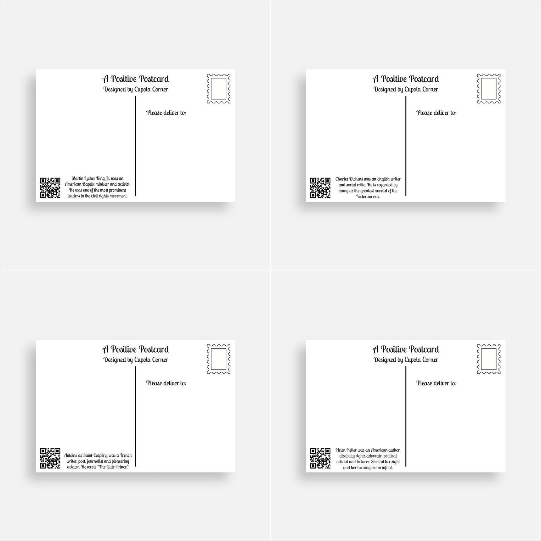 Choose from two different sets of floral heart postcards. The "Hello" postcards feature greetings in ten different languages + English. The inspirational postcards highlight four different famous quotes by famous people (Helen Keller, Martin Luther King Jr., Charles Dickens and Antoine de St-Exupéry). These postcards are great for sending to friends and family just to let them know that you are thinking about them. Everyone loves to get "good" mail. Be the one who brings a smile to someone's face.